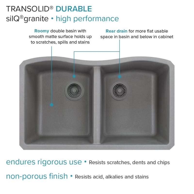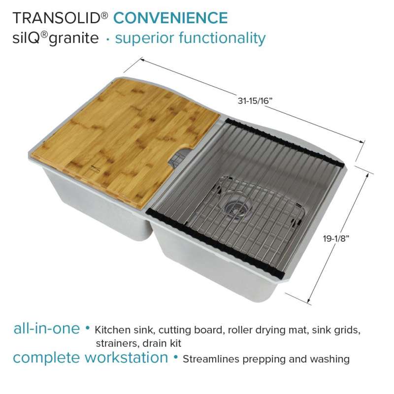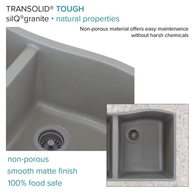 Transolid silQ® granite sinks are made with the union of natural granite and acrylic resin. The result gives Transolid sinks resistance to high temperatures, scratches, dents and chips, as well as impacts and violent shocks. The non-porous 100% food-safe surface grants you peace of mind and reduces the need for cleaning with harsh chemicals. Say goodbye to endless hours of shopping and say hello to pre-matched accessories that will make your sink the perfect multi-functional workspace. Covered by Transolid's lifetime limited residential warranty.