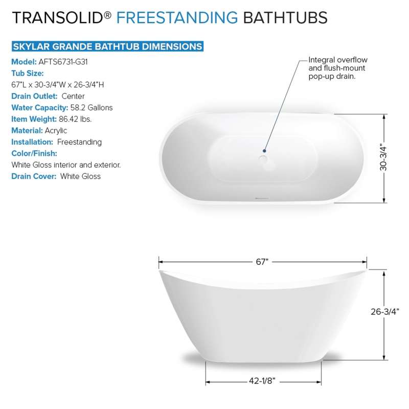 Indulge in luxurious bathing with Transolid's freestanding acrylic bathtub kit. This all-inclusive set features a 67-in glossy white tub with pop-up drain and integrated overflow, stylish tub filler faucet with hand shower, and self-adhering bath pillow. Crafted for durability and easy maintenance, Transolid acrylic bathtubs bring modern elegance and comfort to any space.