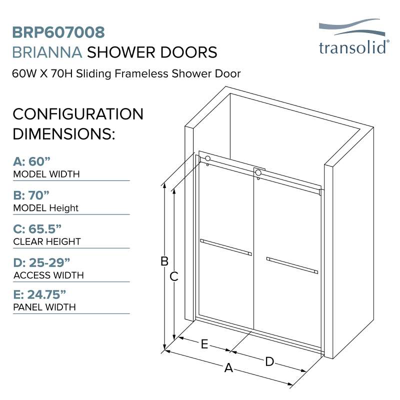 The Transolid Brianna Frameless Double Sliding Shower Door Collection offers an elegant, sophisticated look. It is available in several width and height combinations and features thick, premium 5/16 in. (8mm) clear tempered glass with professionally applied Nano clear glass coating, which provides superior dirt and water repellant and stain resistant benefits. The Brianna door provides up to 3/8 in. of out-of-plumb adjustability on each side to provide a watertight fit in your alcove. The Brianna door is available in several desirable hardware finish options to match your bathroom's interior design and layout perfectly. Built for an alcove (3-wall) shower enclosure, sliding glass shower doors can be opened from left or right with its full by-pass (both panels slide) design. 20 in. (500 mm from center to center) sliding shower door handles also function as towel bars, providing handy storage space for a folded bath towel or two hand towels. Multiple Transolid handle options are available, but this combination features the Sabrina handles in a beautiful Polished Chrome finish. The Sabrina handles feature a unique, high-end design, adding a distinctive look to your Brianna shower door. These handles are substantial in weight and are every bit as functional as they are beautiful. Look for the matching grab bar to complete the look!