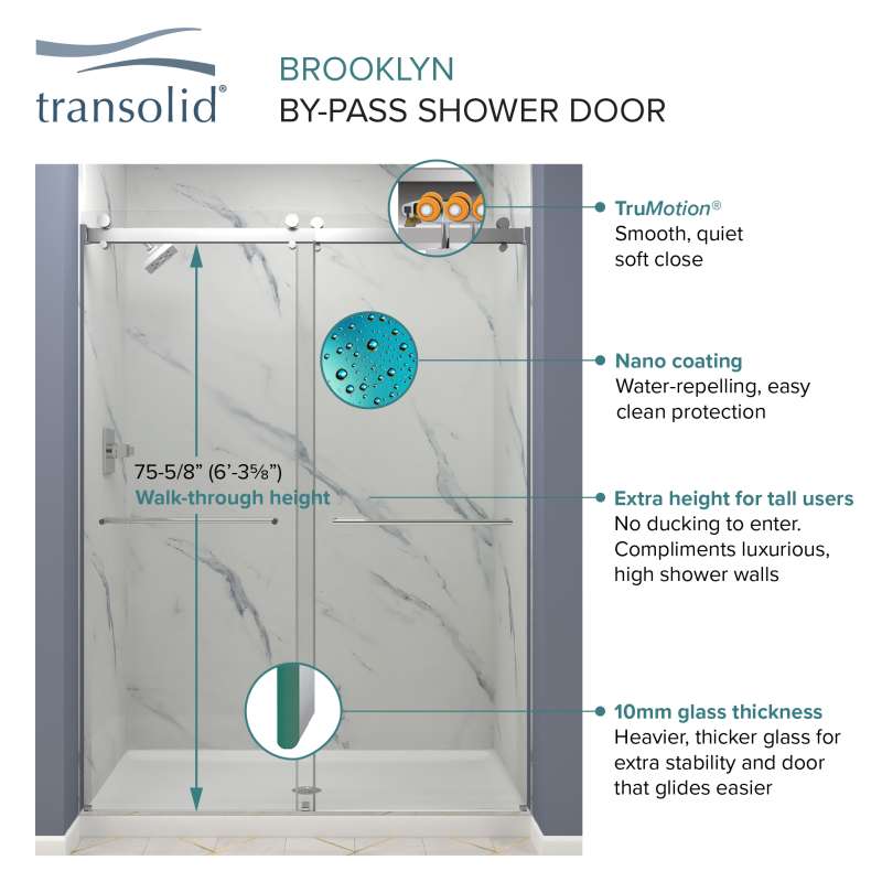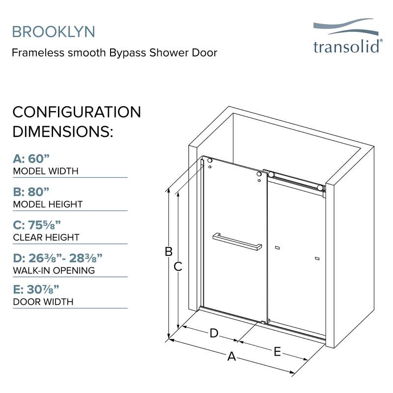 The Transolid Brooklyn Frameless Double Sliding Shower Door Collection offers an elegant, sophisticated look. It is available in 60 in. W x 80 in. H and features thick, premium 3/8 in. (10mm) clear tempered glass with professionally applied Nano clear glass coating, which provides superior dirt and water repellant and stain resistant benefits. The Brooklyn door provides up to 3/8 in. of out-of-plumb adjustability on each side to provide a watertight fit in your alcove. The Brooklyn Door is available in several desirable hardware finish options to match your bathroom's interior design and layout perfectly. Built for an alcove (3-wall) shower enclosure, sliding glass shower doors can be opened from left or right with its full by-pass (both panels slide) design. 20 in. (500 mm from center to center) sliding shower door handles also function as towel bars, providing handy storage space for a folded bath towel or two hand towels. Multiple Transolid handle options are available, but this combination features the Justin handles in a Champagne Bronze finish. The Justin handles feature a unique, high-end design, adding a distinctive look to your Brooklyn shower door. These handles are substantial in weight and are every bit as functional as they are beautiful. Look for the matching grab bar to complete the look!