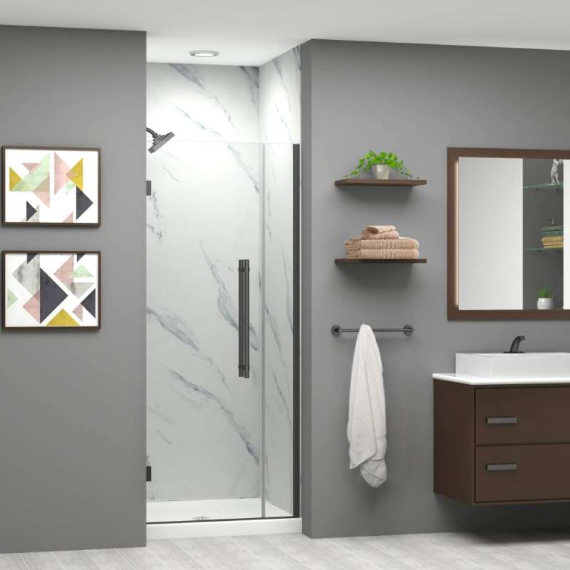 This Transolid Elizabeth shower door has a frameless swing shower door with a fixed panel that is every bit as elegant as it is functional. TruMotion and additional height sets this Elizabeth door apart from its competition. This unique TruMotion slow closing hinge features an adjustable 3 position timing, enabling the user to adjust the closure from either slow or fast paced closing without having to worry about a slamming door. The side wall profile on the stationary panel allows 1/2” out-of-plumb adjustment, making it possible for uneven walls to still hold a beautiful shower door. Transolid exclusive Nano ClearCoat water repellant and stain resistant glass coating adds superior protection from stains and is nearly maintenance-free. With clean lines, modern accents and an upscale look, the Elizabeth collection adds timeless style to any bathroom space.