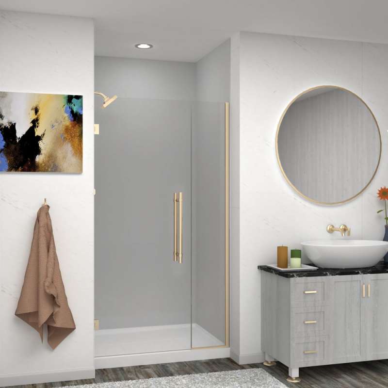 This Transolid Elizabeth shower door has a frameless swing shower door with a fixed panel that is every bit as elegant as it is functional. TruMotion and additional height sets this Elizabeth door apart from its competition. This unique TruMotion slow closing hinge features an adjustable 3 position timing, enabling the user to adjust the closure from either slow or fast paced closing without having to worry about a slamming door. The side wall profile on the stationary panel allows 1/2” out-of-plumb adjustment, making it possible for uneven walls to still hold a beautiful shower door. Transolid exclusive Nano ClearCoat water repellant and stain resistant glass coating adds superior protection from stains and is nearly maintenance-free. With clean lines, modern accents and an upscale look, the Elizabeth collection adds timeless style to any bathroom space.