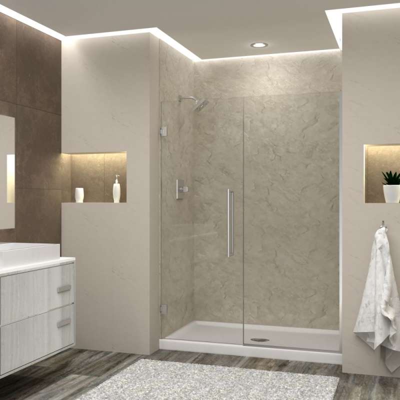 This Transolid Elizabeth shower door has a frameless swing shower door with a fixed panel that is every bit as elegant as it is functional. TruMotion and additional height sets this Elizabeth door apart from its competition. This unique TruMotion slow closing hinge features an adjustable 3 position timing, enabling the user to adjust the closure from either slow or fast paced closing without having to worry about a slamming door. The side wall profile on the stationary panel allows 1/2” out-of-plumb adjustment, making it possible for uneven walls to still hold a beautiful shower door. Transolid exclusive Nano ClearCoat water repellant and stain resistant glass coating adds superior protection from stains and is nearly maintenance-free. With clean lines, modern accents and an upscale look, the Elizabeth collection adds timeless style to any bathroom space.
