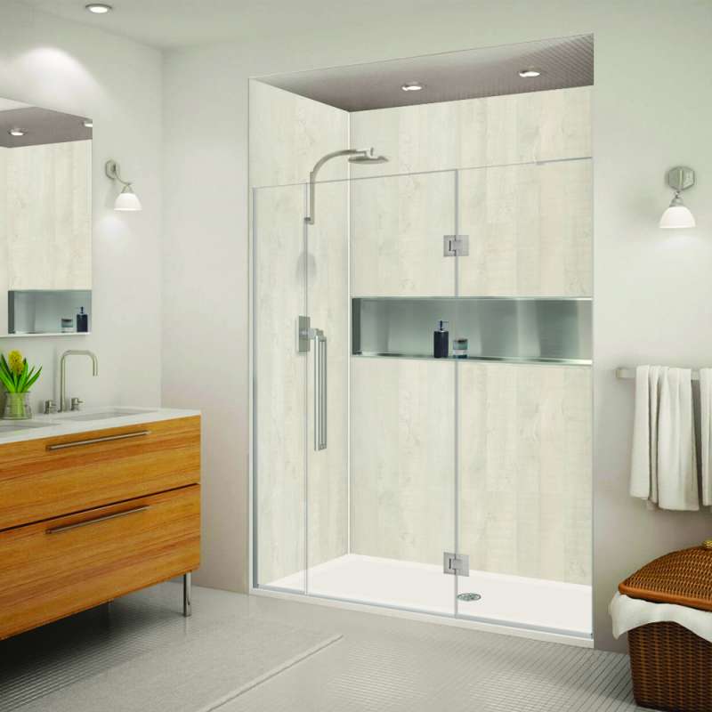 This Transolid Elizabeth shower door has a frameless swing shower door with a fixed panel that is every bit as elegant as it is functional. TruMotion and additional height set this Elizabeth door apart from its competition. This unique TruMotion slow closing hinge features an adjustable 3 position timing, enabling the user to adjust the closure from either slow or fast paced closing without having to worry about a slamming door. The side wall profiles allow 1/2” out-of-plumb adjustment on either side, making it possible for uneven walls to still hold a beautiful shower door. Transolid exclusive Nano ClearCoat water repellant and stain resistant glass coating adds superior protection from stains and is nearly maintenance-free. With clean lines, modern accents and an upscale look, the Elizabeth collection adds timeless style to any bathroom space.