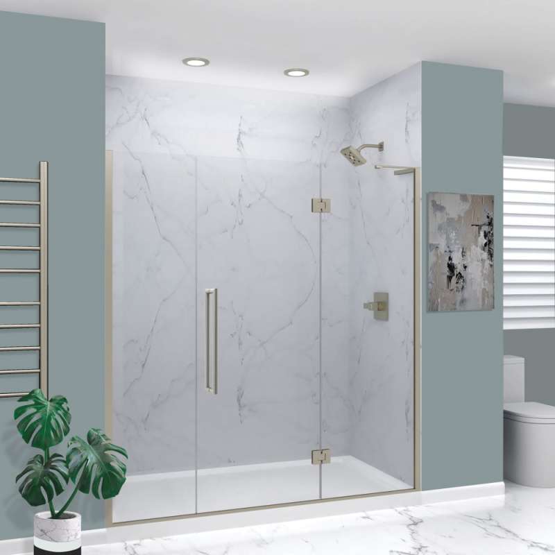 This Transolid Elizabeth shower door has a frameless swing shower door with a fixed panel that is every bit as elegant as it is functional. TruMotion and additional height set this Elizabeth door apart from its competition. This unique TruMotion slow closing hinge features an adjustable 3 position timing, enabling the user to adjust the closure from either slow or fast paced closing without having to worry about a slamming door. The side wall profiles allow 1/2” out-of-plumb adjustment on either side, making it possible for uneven walls to still hold a beautiful shower door. Transolid exclusive Nano ClearCoat water repellant and stain resistant glass coating adds superior protection from stains and is nearly maintenance-free. With clean lines, modern accents and an upscale look, the Elizabeth collection adds timeless style to any bathroom space.