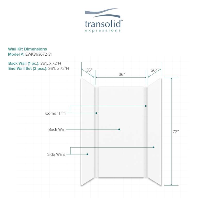 Discover why Transolid's Expression walls would make a beautiful surface for your new bath and shower remodel! Whether you have a walk-in shower or bathtub, these bathroom wall panels are an excellent and economic option. Transolid Expression walls are made of a composite solid surface material which is non-porous, so there are no tiny little holes for the water, bacteria, or mold to creep into. Additionally, Expression walls are easier to install than traditional direct-to-stud shower walls because they glue-up right over the existing surface. The panels feature factory-finished outside edges and can be cut to size, making them adaptable for any bathroom. They are available in 3 solid colors and 6 gorgeous natural patterns that give the look of a high-end bath. The patterns are embedded into the material, creating a beautiful smooth surface that cannot scratch off. Wall kits include 3 wall panels (available in 72-in panel height or 72-in panel with a 24-in extension), 2 color coordinated inside corner trim pieces. Optional kits, such as window trim kits, storage pods, or shower bases are also available and can add a strong design element that really finishes out your space. All Transolid shower walls are backed by a hassle-free 10-year warranty.