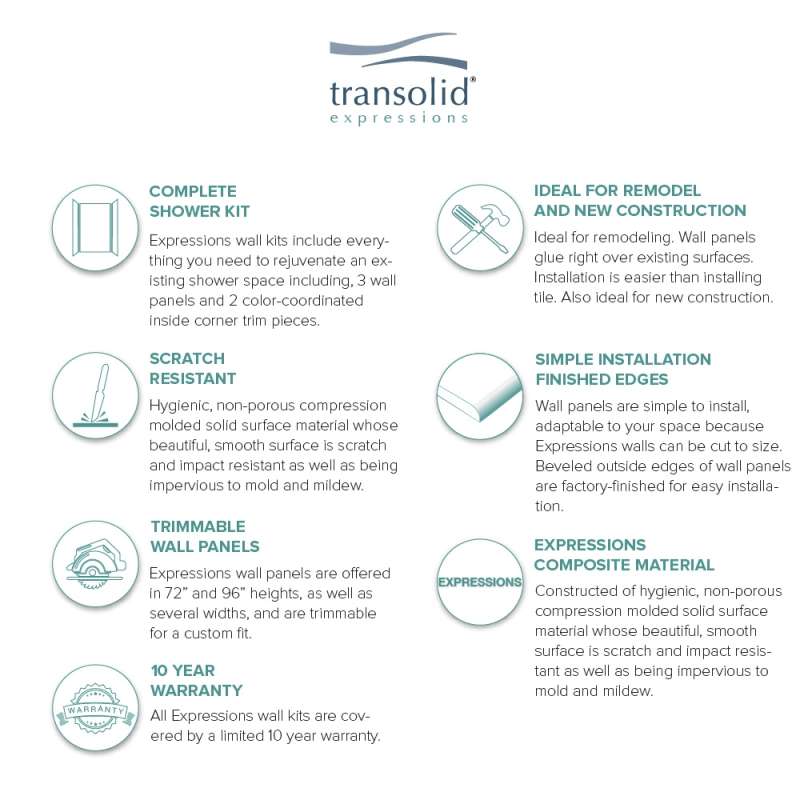 Discover why Transolid's Expression walls would make a beautiful surface for your new bath and shower remodel! Whether you have a walk-in shower or bathtub, these bathroom wall panels are an excellent and economic option. Transolid Expression walls are made of a composite solid surface material which is non-porous, so there are no tiny little holes for the water, bacteria, or mold to creep into. Additionally, Expression walls are easier to install than traditional direct-to-stud shower walls because they glue-up right over the existing surface. The panels feature factory-finished outside edges and can be cut to size, making them adaptable for any bathroom. They are available in 3 solid colors and 6 gorgeous natural patterns that give the look of a high-end bath. The patterns are embedded into the material, creating a beautiful smooth surface that cannot scratch off. Wall kits include 3 wall panels (available in 72-in panel height or 72-in panel with a 24-in extension), 2 color coordinated inside corner trim pieces. Optional kits, such as window trim kits, storage pods, or shower bases are also available and can add a strong design element that really finishes out your space. All Transolid shower walls are backed by a hassle-free 10-year warranty.
