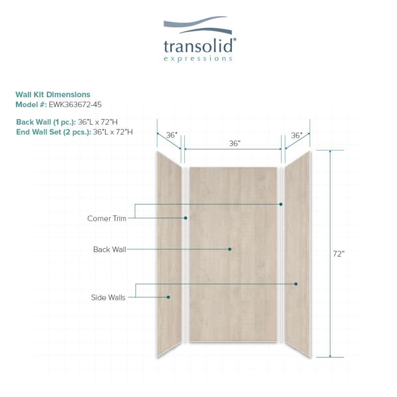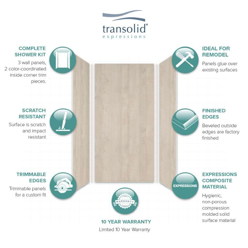 Discover why Transolid's Expression walls would make a beautiful surface for your new bath and shower remodel! Whether you have a walk-in shower or bathtub, these bathroom wall panels are an excellent and economic option. Transolid Expression walls are made of a composite solid surface material which is non-porous, so there are no tiny little holes for the water, bacteria, or mold to creep into. Additionally, Expression walls are easier to install than traditional direct-to-stud shower walls because they glue-up right over the existing surface. The panels feature factory-finished outside edges and can be cut to size, making them adaptable for any bathroom. They are available in 3 solid colors and 6 gorgeous natural patterns that give the look of a high-end bath. The patterns are embedded into the material, creating a beautiful smooth surface that cannot scratch off. Wall kits include 3 wall panels (available in 72-in panel height or 72-in panel with a 24-in extension), 2 color coordinated inside corner trim pieces. Optional kits, such as window trim kits, storage pods, or shower bases are also available and can add a strong design element that really finishes out your space. All Transolid shower walls are backed by a hassle-free 10-year warranty.