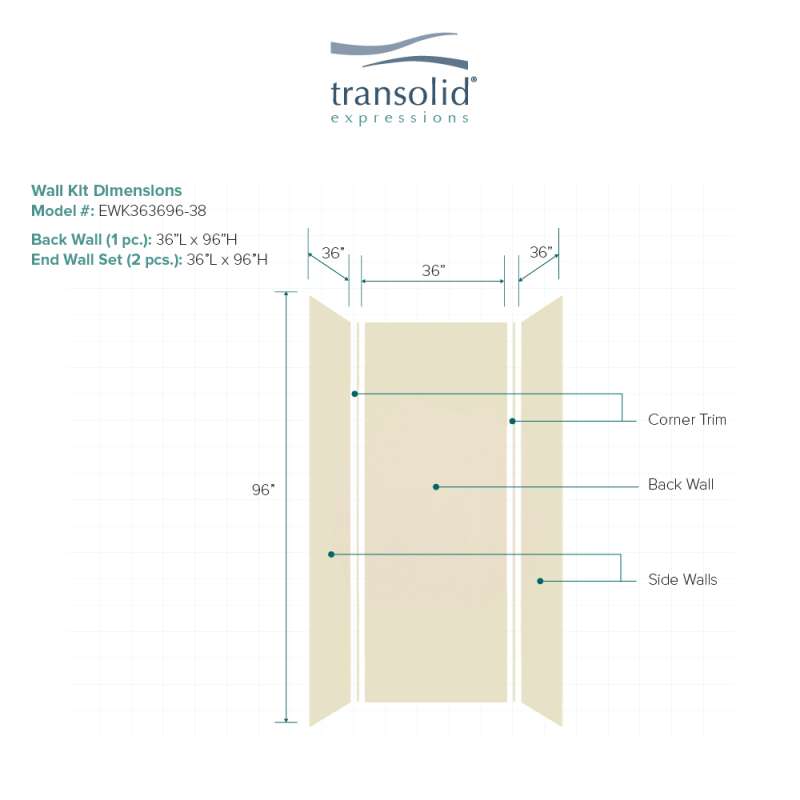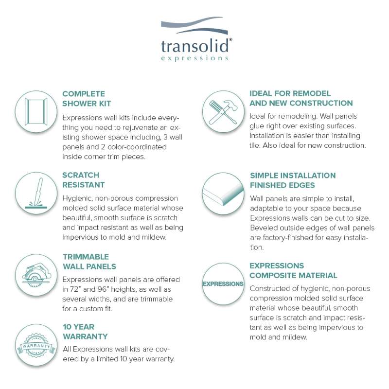 Discover why Transolid's Expression walls would make a beautiful surface for your new bath and shower remodel! Whether you have a walk-in shower or bathtub, these bathroom wall panels are an excellent and economic option. Transolid Expression walls are made of a composite solid surface material which is non-porous, so there are no tiny little holes for the water, bacteria, or mold to creep into. Additionally, Expression walls are easier to install than traditional direct-to-stud shower walls because they glue-up right over the existing surface. The panels feature factory-finished outside edges and can be cut to size, making them adaptable for any bathroom. They are available in 3 solid colors and 6 gorgeous natural patterns that give the look of a high-end bath. The patterns are embedded into the material, creating a beautiful smooth surface that cannot scratch off. Wall kits include 3 wall panels (available in 72-in panel height or 72-in panel with a 24-in extension), 2 color coordinated inside corner trim pieces, 2 tubes of siliconized acrylic caulk. Optional kits, such as window trim kits, storage pods, or shower bases are also available and can add a strong design element that really finishes out your space. All Transolid shower walls are backed by a hassle-free 10-year warranty.