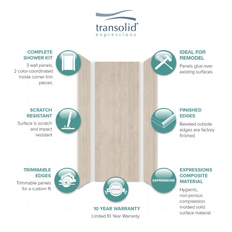 Discover why Transolid's Expression walls would make a beautiful surface for your new bath and shower remodel! Whether you have a walk-in shower or bathtub, these bathroom wall panels are an excellent and economic option. Transolid Expression walls are made of a composite solid surface material which is non-porous, so there are no tiny little holes for the water, bacteria, or mold to creep into. Additionally, Expression walls are easier to install than traditional direct-to-stud shower walls because they glue-up right over the existing surface. The panels feature factory-finished outside edges and can be cut to size, making them adaptable for any bathroom. They are available in 3 solid colors and 6 gorgeous natural patterns that give the look of a high-end bath. The patterns are embedded into the material, creating a beautiful smooth surface that cannot scratch off. Wall kits include 3 wall panels (available in 72-in panel height or 72-in panel with a 24-in extension), 2 color coordinated inside corner trim pieces, 2 tubes of siliconized acrylic caulk. Optional kits, such as window trim kits, storage pods, or shower bases are also available and can add a strong design element that really finishes out your space. All Transolid shower walls are backed by a hassle-free 10-year warranty.