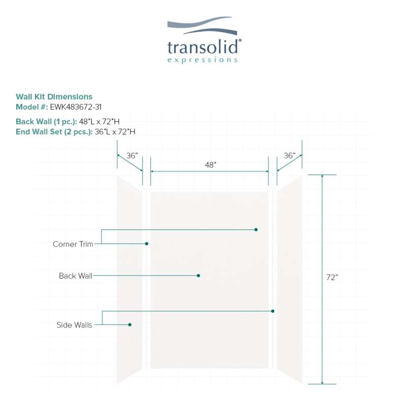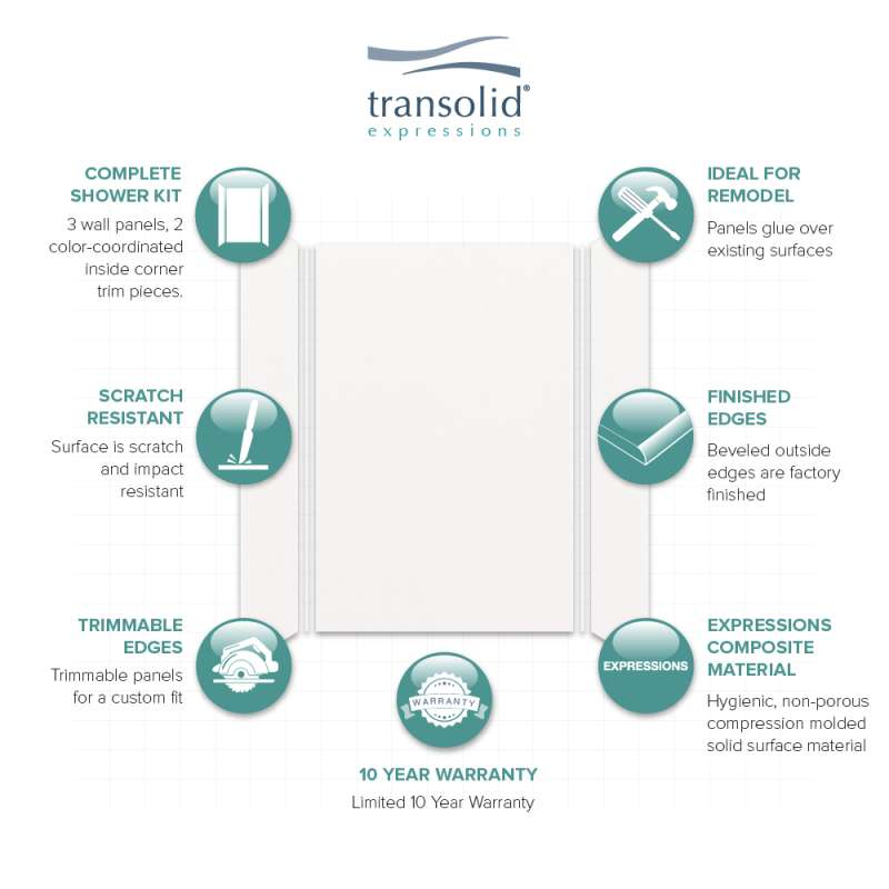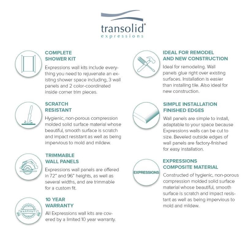 Discover why Transolid's Expression walls would make a beautiful surface for your new bath and shower remodel! Whether you have a walk-in shower or bathtub, these bathroom wall panels are an excellent and economic option. Transolid Expression walls are made of a composite solid surface material which is non-porous, so there are no tiny little holes for the water, bacteria, or mold to creep into. Additionally, Expression walls are easier to install than traditional direct-to-stud shower walls because they glue-up right over the existing surface. The panels feature factory-finished outside edges and can be cut to size, making them adaptable for any bathroom. They are available in 3 solid colors and 6 gorgeous natural patterns that give the look of a high-end bath. The patterns are embedded into the material, creating a beautiful smooth surface that cannot scratch off. Wall kits include 3 wall panels (available in 72-in panel height or 72-in panel with a 24-in extension), 2 color coordinated inside corner trim pieces. Optional kits, such as window trim kits, storage pods, or shower bases are also available and can add a strong design element that really finishes out your space. All Transolid shower walls are backed by a hassle-free 10-year warranty.