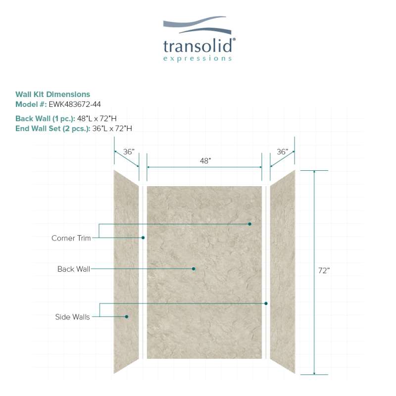 Discover why Transolid's Expression walls would make a beautiful surface for your new bath and shower remodel! Whether you have a walk-in shower or bathtub, these bathroom wall panels are an excellent and economic option. Transolid Expression walls are made of a composite solid surface material which is non-porous, so there are no tiny little holes for the water, bacteria, or mold to creep into. Additionally, Expression walls are easier to install than traditional direct-to-stud shower walls because they glue-up right over the existing surface. The panels feature factory-finished outside edges and can be cut to size, making them adaptable for any bathroom. They are available in 3 solid colors and 6 gorgeous natural patterns that give the look of a high-end bath. The patterns are embedded into the material, creating a beautiful smooth surface that cannot scratch off. Wall kits include 3 wall panels (available in 72-in panel height or 72-in panel with a 24-in extension), 2 color coordinated inside corner trim pieces. Optional kits, such as window trim kits, storage pods, or shower bases are also available and can add a strong design element that really finishes out your space. All Transolid shower walls are backed by a hassle-free 10-year warranty.