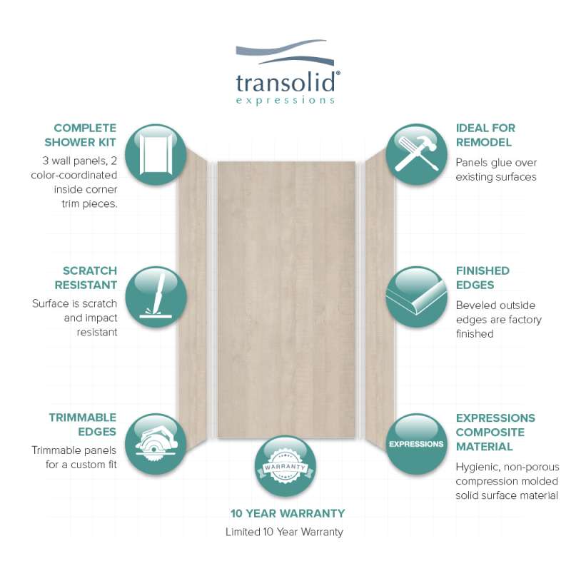 Discover why Transolid's Expression walls would make a beautiful surface for your new bath and shower remodel! Whether you have a walk-in shower or bathtub, these bathroom wall panels are an excellent and economic option. Transolid Expression walls are made of a composite solid surface material which is non-porous, so there are no tiny little holes for the water, bacteria, or mold to creep into. Additionally, Expression walls are easier to install than traditional direct-to-stud shower walls because they glue-up right over the existing surface. The panels feature factory-finished outside edges and can be cut to size, making them adaptable for any bathroom. They are available in 3 solid colors and 6 gorgeous natural patterns that give the look of a high-end bath. The patterns are embedded into the material, creating a beautiful smooth surface that cannot scratch off. Wall kits include 3 wall panels (available in 72-in panel height or 72-in panel with a 24-in extension), 2 color coordinated inside corner trim pieces, 2 tubes of siliconized acrylic caulk. Optional kits, such as window trim kits, storage pods, or shower bases are also available and can add a strong design element that really finishes out your space. All Transolid shower walls are backed by a hassle-free 10-year warranty.