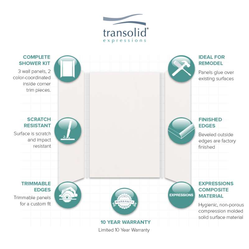 Discover why Transolid's Expression walls would make a beautiful surface for your new bath and shower remodel! Whether you have a walk-in shower or bathtub, these bathroom wall panels are an excellent and economic option. Transolid Expression walls are made of a composite solid surface material which is non-porous, so there are no tiny little holes for the water, bacteria, or mold to creep into. Additionally, Expression walls are easier to install than traditional direct-to-stud shower walls because they glue-up right over the existing surface. The panels feature factory-finished outside edges and can be cut to size, making them adaptable for any bathroom. They are available in 3 solid colors and 6 gorgeous natural patterns that give the look of a high-end bath. The patterns are embedded into the material, creating a beautiful smooth surface that cannot scratch off. Wall kits include 3 wall panels (available in 72-in panel height or 72-in panel with a 24-in extension), 2 color coordinated inside corner trim pieces. Optional kits, such as window trim kits, storage pods, or shower bases are also available and can add a strong design element that really finishes out your space. All Transolid shower walls are backed by a hassle-free 10-year warranty.