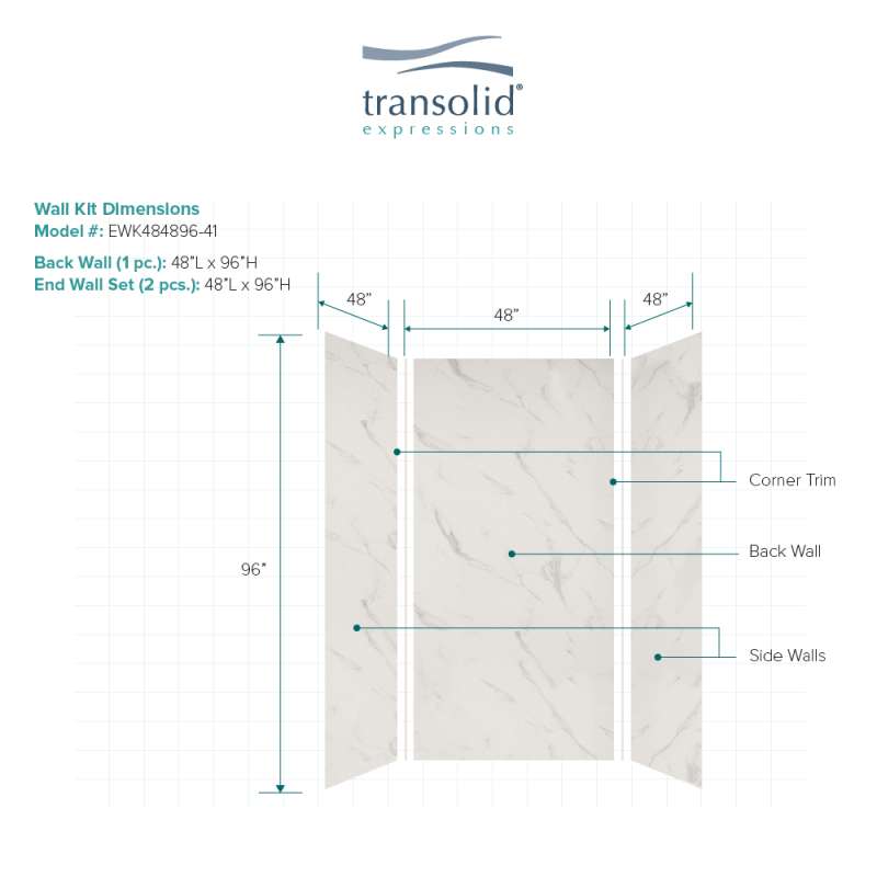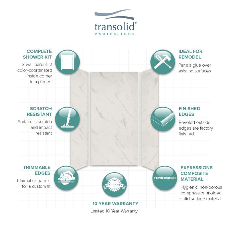 Discover why Transolid's Expression walls would make a beautiful surface for your new bath and shower remodel! Whether you have a walk-in shower or bathtub, these bathroom wall panels are an excellent and economic option. Transolid Expression walls are made of a composite solid surface material which is non-porous, so there are no tiny little holes for the water, bacteria, or mold to creep into. Additionally, Expression walls are easier to install than traditional direct-to-stud shower walls because they glue-up right over the existing surface. The panels feature factory-finished outside edges and can be cut to size, making them adaptable for any bathroom. They are available in 3 solid colors and 6 gorgeous natural patterns that give the look of a high-end bath. The patterns are embedded into the material, creating a beautiful smooth surface that cannot scratch off. Wall kits include 3 wall panels (available in 72-in panel height or 72-in panel with a 24-in extension), 2 color coordinated inside corner trim pieces, 2 tubes of siliconized acrylic caulk. Optional kits, such as window trim kits, storage pods, or shower bases are also available and can add a strong design element that really finishes out your space. All Transolid shower walls are backed by a hassle-free 10-year warranty.