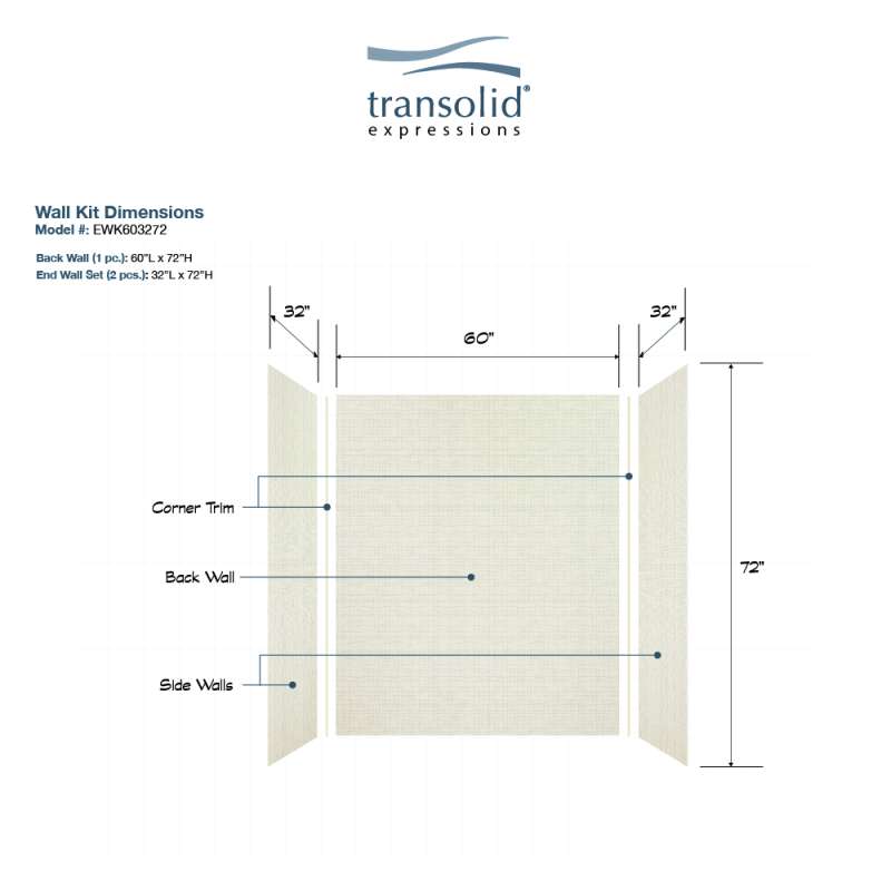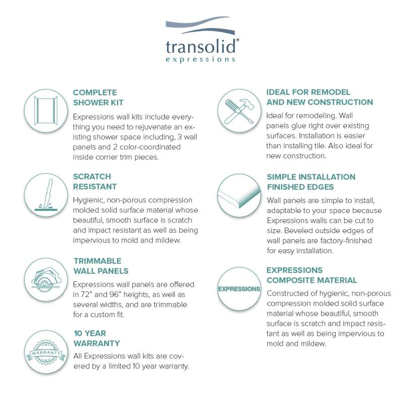 Discover why Transolid's Expression walls would make a beautiful surface for your new bath and shower remodel! Whether you have a walk-in shower or bathtub, these bathroom wall panels are an excellent and economic option. Transolid Expression walls are made of a composite solid surface material which is non-porous, so there are no tiny little holes for the water, bacteria, or mold to creep into. Additionally, Expression walls are easier to install than traditional direct-to-stud shower walls because they glue-up right over the existing surface. The panels feature factory-finished outside edges and can be cut to size, making them adaptable for any bathroom. They are available in 3 solid colors and 6 gorgeous natural patterns that give the look of a high-end bath. The patterns are embedded into the material, creating a beautiful smooth surface that cannot scratch off. Wall kits include 3 wall panels (available in 72-in panel height or 72-in panel with a 24-in extension), 2 color coordinated inside corner trim pieces. Optional kits, such as window trim kits, storage pods, or shower bases are also available and can add a strong design element that really finishes out your space. All Transolid shower walls are backed by a hassle-free 10-year warranty.