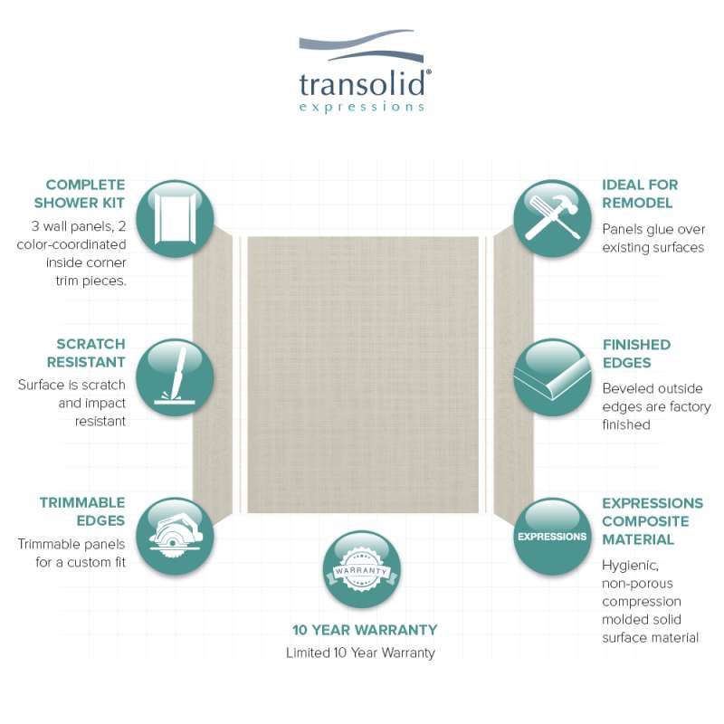 Discover why Transolid's Expression walls would make a beautiful surface for your new bath and shower remodel! Whether you have a walk-in shower or bathtub, these bathroom wall panels are an excellent and economic option. Transolid Expression walls are made of a composite solid surface material which is non-porous, so there are no tiny little holes for the water, bacteria, or mold to creep into. Additionally, Expression walls are easier to install than traditional direct-to-stud shower walls because they glue-up right over the existing surface. The panels feature factory-finished outside edges and can be cut to size, making them adaptable for any bathroom. They are available in 3 solid colors and 6 gorgeous natural patterns that give the look of a high-end bath. The patterns are embedded into the material, creating a beautiful smooth surface that cannot scratch off. Wall kits include 3 wall panels (available in 72-in panel height or 72-in panel with a 24-in extension), 2 color coordinated inside corner trim pieces. Optional kits, such as window trim kits, storage pods, or shower bases are also available and can add a strong design element that really finishes out your space. All Transolid shower walls are backed by a hassle-free 10-year warranty.
