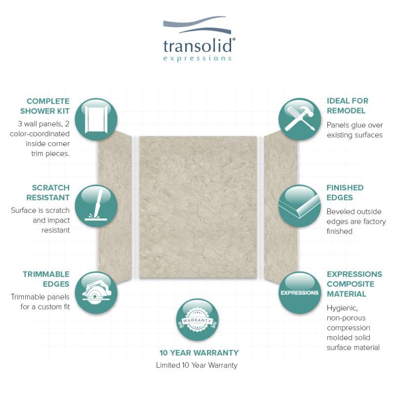 Discover why Transolid's Expression walls would make a beautiful surface for your new bath and shower remodel! Whether you have a walk-in shower or bathtub, these bathroom wall panels are an excellent and economic option. Transolid Expression walls are made of a composite solid surface material which is non-porous, so there are no tiny little holes for the water, bacteria, or mold to creep into. Additionally, Expression walls are easier to install than traditional direct-to-stud shower walls because they glue-up right over the existing surface. The panels feature factory-finished outside edges and can be cut to size, making them adaptable for any bathroom. They are available in 3 solid colors and 6 gorgeous natural patterns that give the look of a high-end bath. The patterns are embedded into the material, creating a beautiful smooth surface that cannot scratch off. Wall kits include 3 wall panels (available in 72-in panel height or 72-in panel with a 24-in extension), 2 color coordinated inside corner trim pieces. Optional kits, such as window trim kits, storage pods, or shower bases are also available and can add a strong design element that really finishes out your space. All Transolid shower walls are backed by a hassle-free 10-year warranty.