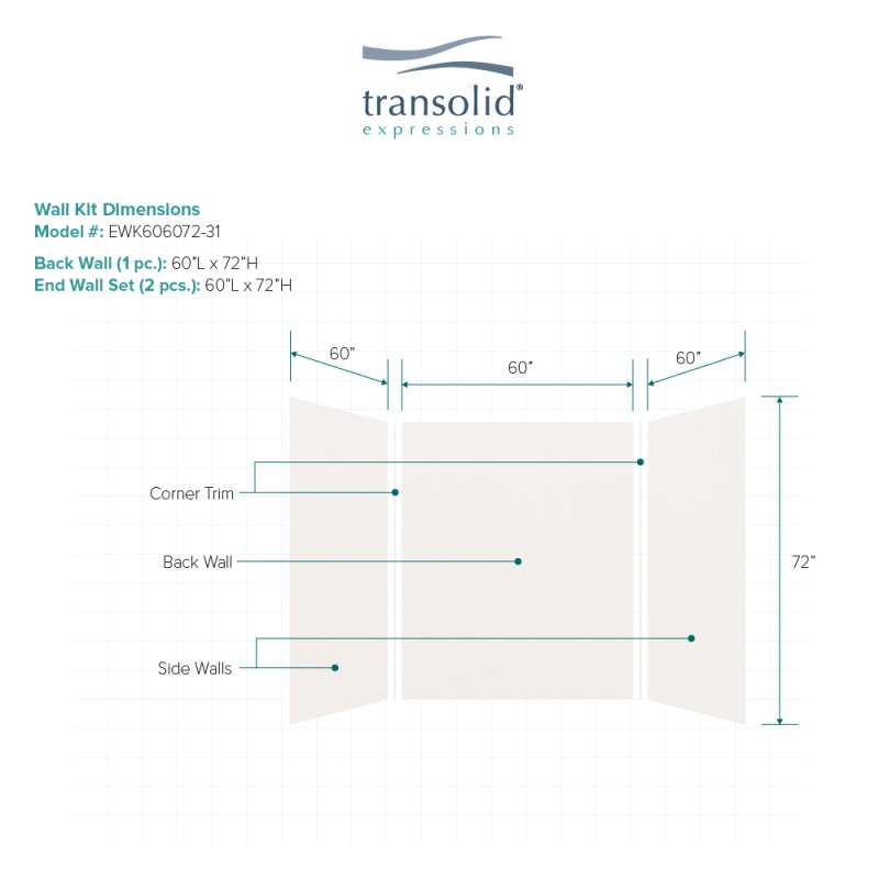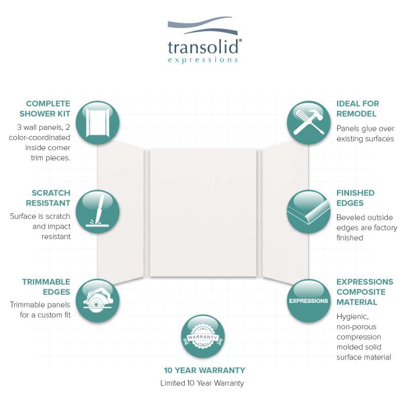 Discover why Transolid's Expression walls would make a beautiful surface for your new bath and shower remodel! Whether you have a walk-in shower or bathtub, these bathroom wall panels are an excellent and economic option. Transolid Expression walls are made of a composite solid surface material which is non-porous, so there are no tiny little holes for the water, bacteria, or mold to creep into. Additionally, Expression walls are easier to install than traditional direct-to-stud shower walls because they glue-up right over the existing surface. The panels feature factory-finished outside edges and can be cut to size, making them adaptable for any bathroom. They are available in 3 solid colors and 6 gorgeous natural patterns that give the look of a high-end bath. The patterns are embedded into the material, creating a beautiful smooth surface that cannot scratch off. Wall kits include 3 wall panels (available in 72-in panel height or 72-in panel with a 24-in extension), 2 color coordinated inside corner trim pieces. Optional kits, such as window trim kits, storage pods, or shower bases are also available and can add a strong design element that really finishes out your space. All Transolid shower walls are backed by a hassle-free 10-year warranty.