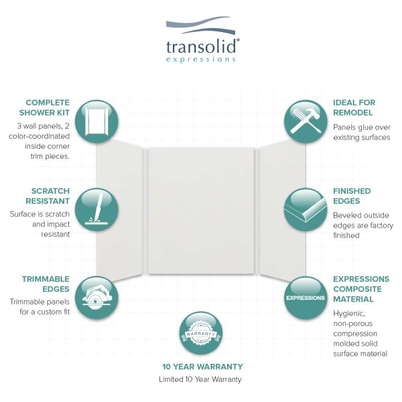 Discover why Transolid's Expression walls would make a beautiful surface for your new bath and shower remodel! Whether you have a walk-in shower or bathtub, these bathroom wall panels are an excellent and economic option. Transolid Expression walls are made of a composite solid surface material which is non-porous, so there are no tiny little holes for the water, bacteria, or mold to creep into. Additionally, Expression walls are easier to install than traditional direct-to-stud shower walls because they glue-up right over the existing surface. The panels feature factory-finished outside edges and can be cut to size, making them adaptable for any bathroom. They are available in 3 solid colors and 6 gorgeous natural patterns that give the look of a high-end bath. The patterns are embedded into the material, creating a beautiful smooth surface that cannot scratch off. Wall kits include 3 wall panels (available in 72-in panel height or 72-in panel with a 24-in extension), 2 color coordinated inside corner trim pieces. Optional kits, such as window trim kits, storage pods, or shower bases are also available and can add a strong design element that really finishes out your space. All Transolid shower walls are backed by a hassle-free 10-year warranty.