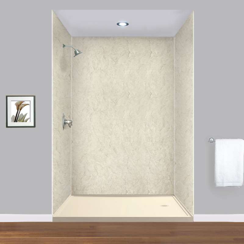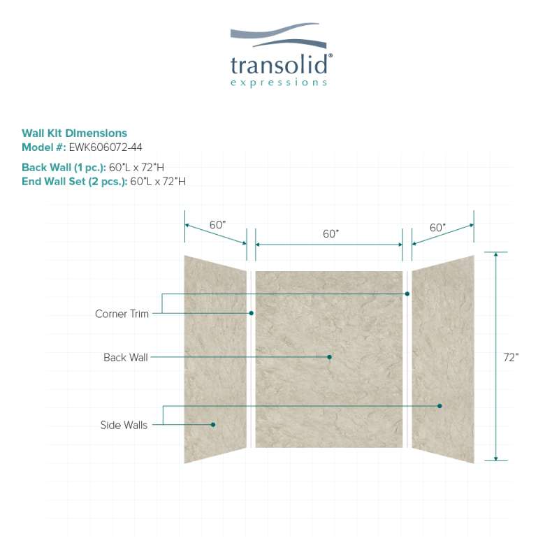 Discover why Transolid's Expression walls would make a beautiful surface for your new bath and shower remodel! Whether you have a walk-in shower or bathtub, these bathroom wall panels are an excellent and economic option. Transolid Expression walls are made of a composite solid surface material which is non-porous, so there are no tiny little holes for the water, bacteria, or mold to creep into. Additionally, Expression walls are easier to install than traditional direct-to-stud shower walls because they glue-up right over the existing surface. The panels feature factory-finished outside edges and can be cut to size, making them adaptable for any bathroom. They are available in 3 solid colors and 6 gorgeous natural patterns that give the look of a high-end bath. The patterns are embedded into the material, creating a beautiful smooth surface that cannot scratch off. Wall kits include 3 wall panels (available in 72-in panel height or 72-in panel with a 24-in extension), 2 color coordinated inside corner trim pieces. Optional kits, such as window trim kits, storage pods, or shower bases are also available and can add a strong design element that really finishes out your space. All Transolid shower walls are backed by a hassle-free 10-year warranty.