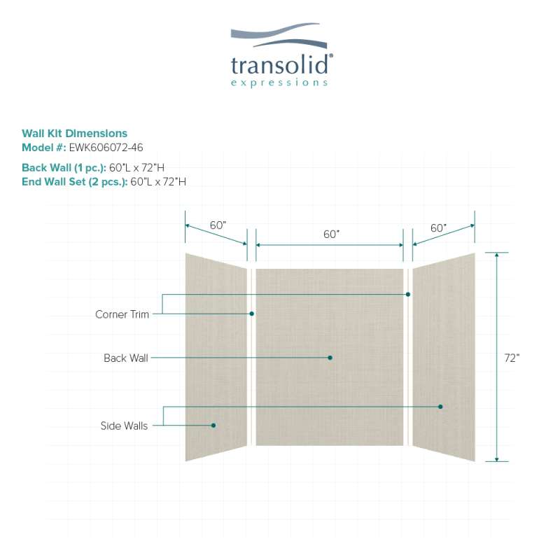 Discover why Transolid's Expression walls would make a beautiful surface for your new bath and shower remodel! Whether you have a walk-in shower or bathtub, these bathroom wall panels are an excellent and economic option. Transolid Expression walls are made of a composite solid surface material which is non-porous, so there are no tiny little holes for the water, bacteria, or mold to creep into. Additionally, Expression walls are easier to install than traditional direct-to-stud shower walls because they glue-up right over the existing surface. The panels feature factory-finished outside edges and can be cut to size, making them adaptable for any bathroom. They are available in 3 solid colors and 6 gorgeous natural patterns that give the look of a high-end bath. The patterns are embedded into the material, creating a beautiful smooth surface that cannot scratch off. Wall kits include 3 wall panels (available in 72-in panel height or 72-in panel with a 24-in extension), 2 color coordinated inside corner trim pieces. Optional kits, such as window trim kits, storage pods, or shower bases are also available and can add a strong design element that really finishes out your space. All Transolid shower walls are backed by a hassle-free 10-year warranty.