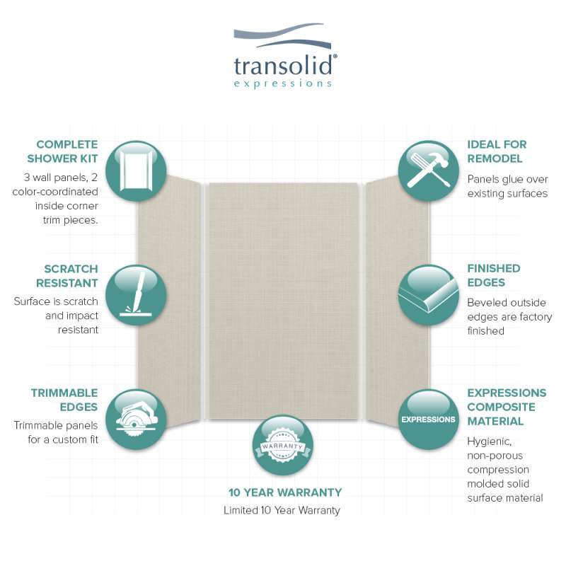 Discover why Transolid's Expression walls would make a beautiful surface for your new bath and shower remodel! Whether you have a walk-in shower or bathtub, these bathroom wall panels are an excellent and economic option. Transolid Expression walls are made of a composite solid surface material which is non-porous, so there are no tiny little holes for the water, bacteria, or mold to creep into. Additionally, Expression walls are easier to install than traditional direct-to-stud shower walls because they glue-up right over the existing surface. The panels feature factory-finished outside edges and can be cut to size, making them adaptable for any bathroom. They are available in 3 solid colors and 6 gorgeous natural patterns that give the look of a high-end bath. The patterns are embedded into the material, creating a beautiful smooth surface that cannot scratch off. Wall kits include 3 wall panels (available in 72-in panel height or 72-in panel with a 24-in extension), 2 color coordinated inside corner trim pieces, 2 tubes of siliconized acrylic caulk. Optional kits, such as window trim kits, storage pods, or shower bases are also available and can add a strong design element that really finishes out your space. All Transolid shower walls are backed by a hassle-free 10-year warranty.