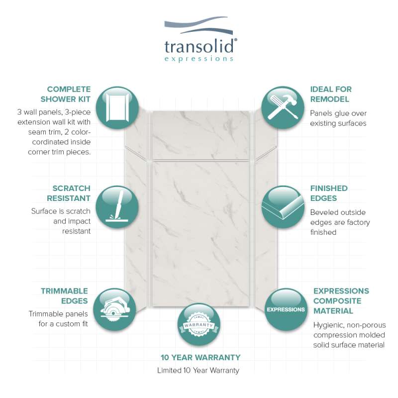 Discover why Transolid's Expression walls would make a beautiful surface for your new bath and shower remodel! Whether you have a walk-in shower or bathtub, these bathroom wall panels are an excellent and economic option. Transolid Expression walls are made of a composite solid surface material which is non-porous, so there are no tiny little holes for the water, bacteria, or mold to creep into. Additionally, Expression walls are easier to install than traditional direct-to-stud shower walls because they glue-up right over the existing surface. The panels feature factory-finished outside edges and can be cut to size, making them adaptable for any bathroom. They are available in 3 solid colors and 6 gorgeous natural patterns that give the look of a high-end bath. The patterns are embedded into the material, creating a beautiful smooth surface that cannot scratch off. Wall kits include 3 wall panels (available in 72-in panel height or 72-in panel with a 24-in extension), 2 color coordinated inside corner trim pieces, 2 tubes of siliconized acrylic caulk. Optional kits, such as window trim kits, storage pods, or shower bases are also available and can add a strong design element that really finishes out your space. All Transolid shower walls are backed by a hassle-free 10-year warranty.