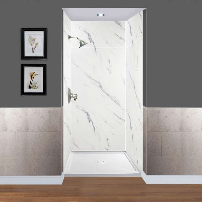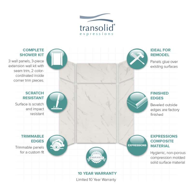 Discover why Transolid's Expression walls would make a beautiful surface for your new bath and shower remodel! Whether you have a walk-in shower or bathtub, these bathroom wall panels are an excellent and economic option. Transolid Expression walls are made of a composite solid surface material which is non-porous, so there are no tiny little holes for the water, bacteria, or mold to creep into. Additionally, Expression walls are easier to install than traditional direct-to-stud shower walls because they glue-up right over the existing surface. The panels feature factory-finished outside edges and can be cut to size, making them adaptable for any bathroom. They are available in 3 solid colors and 6 gorgeous natural patterns that give the look of a high-end bath. The patterns are embedded into the material, creating a beautiful smooth surface that cannot scratch off. Wall kits include 3 wall panels (available in 72-in panel height or 72-in panel with a 24-in extension), 2 color coordinated inside corner trim pieces, 2 tubes of siliconized acrylic caulk. Optional kits, such as window trim kits, storage pods, or shower bases are also available and can add a strong design element that really finishes out your space. All Transolid shower walls are backed by a hassle-free 10-year warranty.