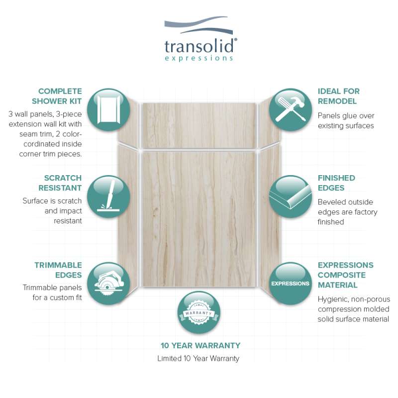 Discover why Transolid's Expression walls would make a beautiful surface for your new bath and shower remodel! Whether you have a walk-in shower or bathtub, these bathroom wall panels are an excellent and economic option. Transolid Expression walls are made of a composite solid surface material which is non-porous, so there are no tiny little holes for the water, bacteria, or mold to creep into. Additionally, Expression walls are easier to install than traditional direct-to-stud shower walls because they glue-up right over the existing surface. The panels feature factory-finished outside edges and can be cut to size, making them adaptable for any bathroom. They are available in 3 solid colors and 6 gorgeous natural patterns that give the look of a high-end bath. The patterns are embedded into the material, creating a beautiful smooth surface that cannot scratch off. Wall kits include 3 wall panels (available in 72-in panel height or 72-in panel with a 24-in extension), 2 color coordinated inside corner trim pieces, 2 tubes of siliconized acrylic caulk. Optional kits, such as window trim kits, storage pods, or shower bases are also available and can add a strong design element that really finishes out your space. All Transolid shower walls are backed by a hassle-free 10-year warranty.
