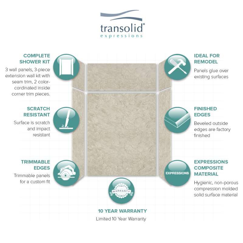 Discover why Transolid's Expression walls would make a beautiful surface for your new bath and shower remodel! Whether you have a walk-in shower or bathtub, these bathroom wall panels are an excellent and economic option. Transolid Expression walls are made of a composite solid surface material which is non-porous, so there are no tiny little holes for the water, bacteria, or mold to creep into. Additionally, Expression walls are easier to install than traditional direct-to-stud shower walls because they glue-up right over the existing surface. The panels feature factory-finished outside edges and can be cut to size, making them adaptable for any bathroom. They are available in 3 solid colors and 6 gorgeous natural patterns that give the look of a high-end bath. The patterns are embedded into the material, creating a beautiful smooth surface that cannot scratch off. Wall kits include 3 wall panels (available in 72-in panel height or 72-in panel with a 24-in extension), 2 color coordinated inside corner trim pieces, 2 tubes of siliconized acrylic caulk. Optional kits, such as window trim kits, storage pods, or shower bases are also available and can add a strong design element that really finishes out your space. All Transolid shower walls are backed by a hassle-free 10-year warranty.