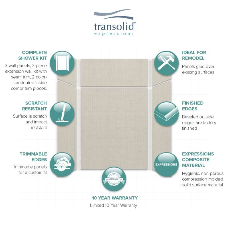 Discover why Transolid's Expression walls would make a beautiful surface for your new bath and shower remodel! Whether you have a walk-in shower or bathtub, these bathroom wall panels are an excellent and economic option. Transolid Expression walls are made of a composite solid surface material which is non-porous, so there are no tiny little holes for the water, bacteria, or mold to creep into. Additionally, Expression walls are easier to install than traditional direct-to-stud shower walls because they glue-up right over the existing surface. The panels feature factory-finished outside edges and can be cut to size, making them adaptable for any bathroom. They are available in 3 solid colors and 6 gorgeous natural patterns that give the look of a high-end bath. The patterns are embedded into the material, creating a beautiful smooth surface that cannot scratch off. Wall kits include 3 wall panels (available in 72-in panel height or 72-in panel with a 24-in extension), 2 color coordinated inside corner trim pieces, 2 tubes of siliconized acrylic caulk. Optional kits, such as window trim kits, storage pods, or shower bases are also available and can add a strong design element that really finishes out your space. All Transolid shower walls are backed by a hassle-free 10-year warranty.