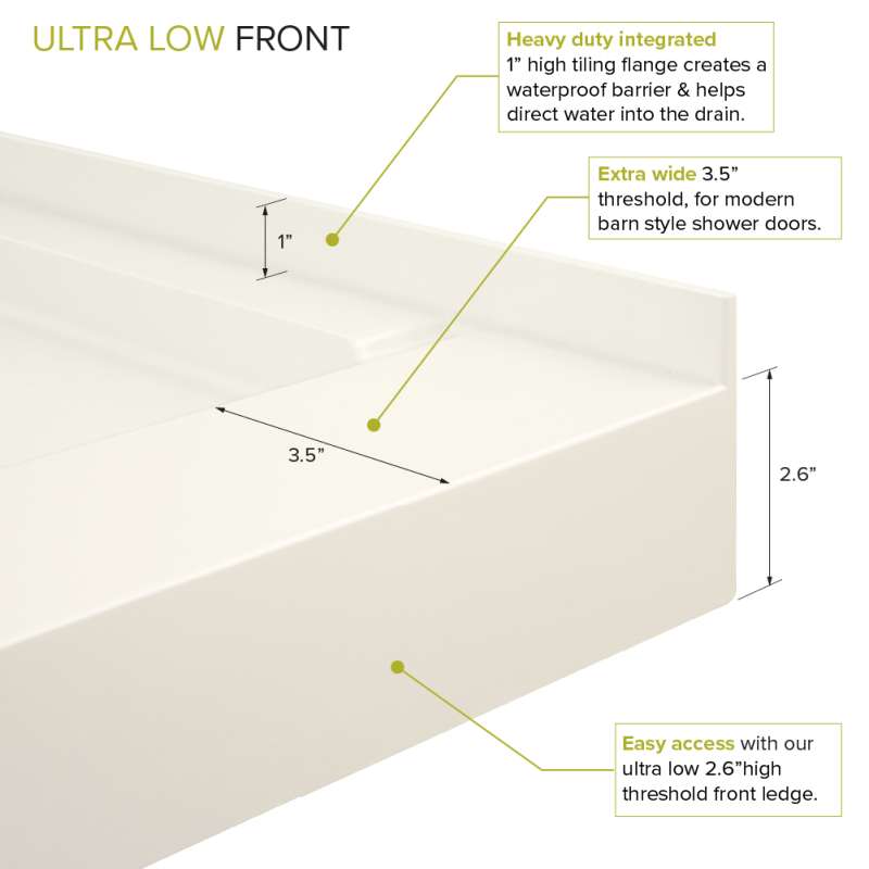 Transolid Ultra Low Linear shower bases are the perfect choice to replace an old tub. They are available in 60-in x 30-in and 60-in x 32-in to accommodate traditional tub sizes and the drain measures 8-1/4-in from the wall to line up with an existing tub drain. Made of numerous layers of Transtone, a sheet-molded compound material that is solid throughout the base and is supported by sturdy structural ribs underneath that radiate out from the drain opening. When combined with a thinset mortar installation, this creates a flex-free, water-tight installation and a foundation that you can count on. The base features a 2.6-in ultra-low threshold that is just a smidgen wider to even accommodate popular farmhouse style barn doors. The surface is scratch, impact and slip resistant with a beautiful slate finish for a minimalist look.