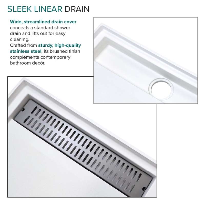 Introducing our commercial-grade shower base, engineered for durability and performance. Featuring a heavy-duty stainless steel trench drain cover, this base is built to withstand high-traffic environments with ease. The finely textured slip-resistant surface provides added safety, while the solid surface material offers density and consistency throughout, making it easy to repair. It is cast as a single piece, ensuring a soft-to-the-touch surface with a gentle matte finish.
