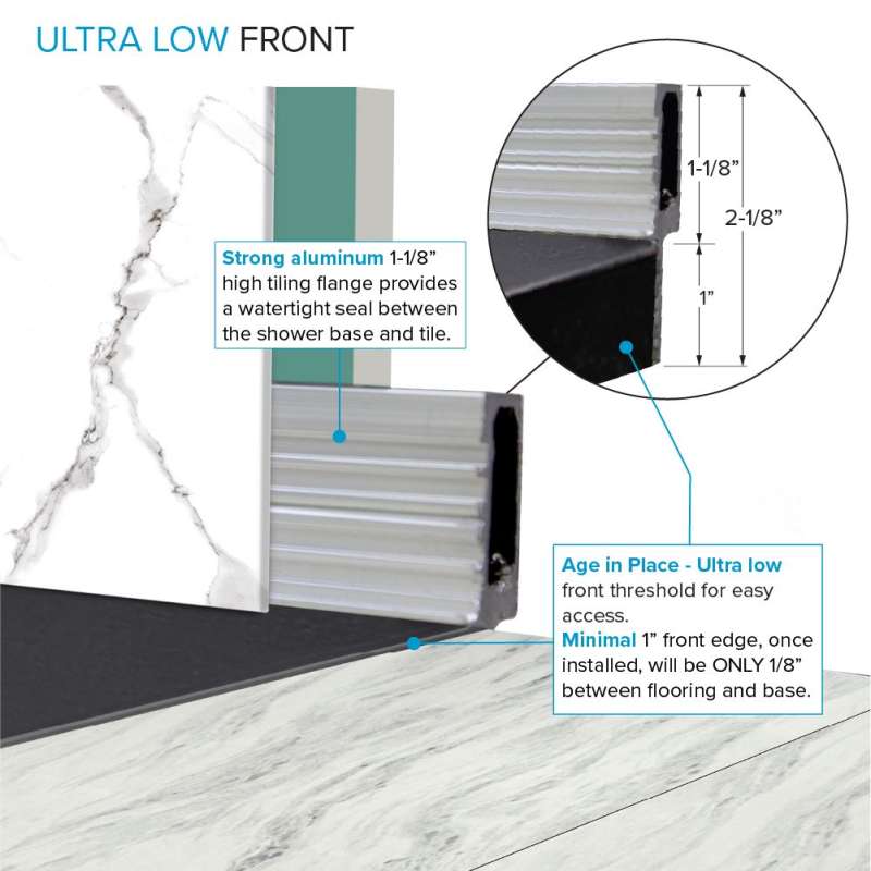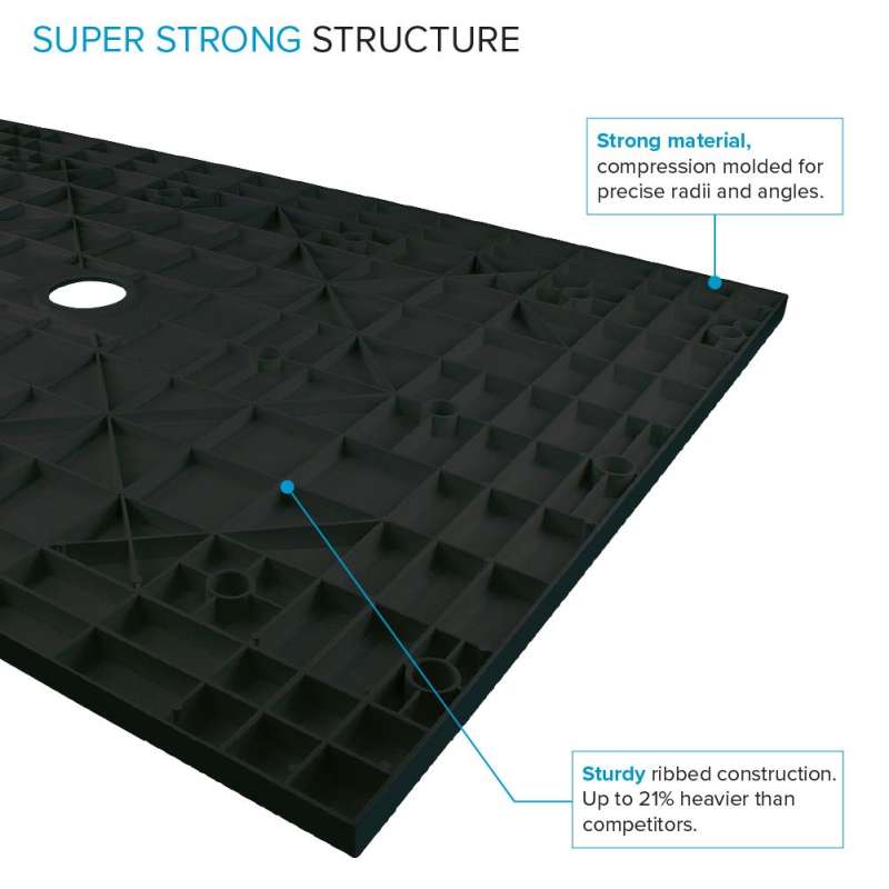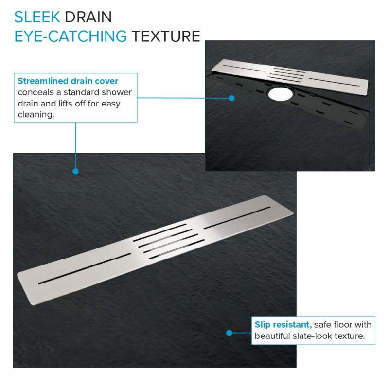 Experience the ultimate shower solution with zero threshold shower bases. Crafted from solid sheet-molded compound material with sturdy structural ribs, it ensures durability and stability. Field trimmable for customization. Install with thinset mortar for a reliable, water-tight foundation. With a slip-resistant slate finish, it's perfect for easy entry and flush shower floor aesthetics. Compatible with single, double, or triple threshold installations, it offers versatility for any bathroom.