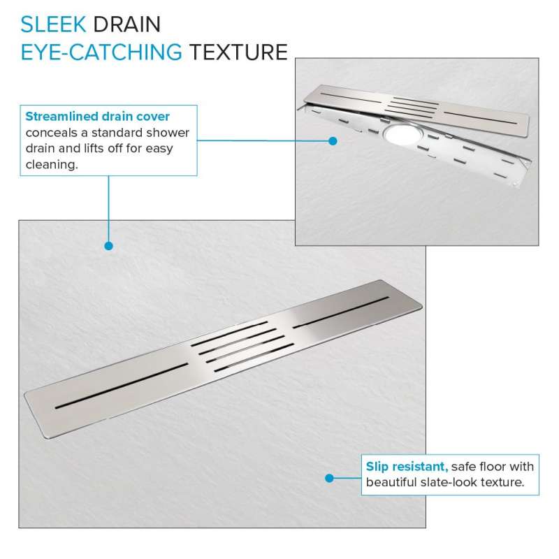 Experience the ultimate shower solution with zero threshold shower bases. Crafted from solid sheet-molded compound material with sturdy structural ribs, it ensures durability and stability. Field trimmable for customization. Install with thinset mortar for a reliable, water-tight foundation. With a slip-resistant slate finish, it's perfect for easy entry and flush shower floor aesthetics. Compatible with single, double, or triple threshold installations, it offers versatility for any bathroom.
