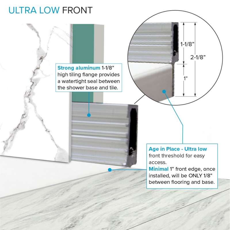 Experience the ultimate shower solution with zero threshold shower bases. Crafted from solid sheet-molded compound material with sturdy structural ribs, it ensures durability and stability. Field trimmable for customization. Install with thinset mortar for a reliable, water-tight foundation. With a slip-resistant slate finish, it's perfect for easy entry and flush shower floor aesthetics. Compatible with single, double, or triple threshold installations, it offers versatility for any bathroom.