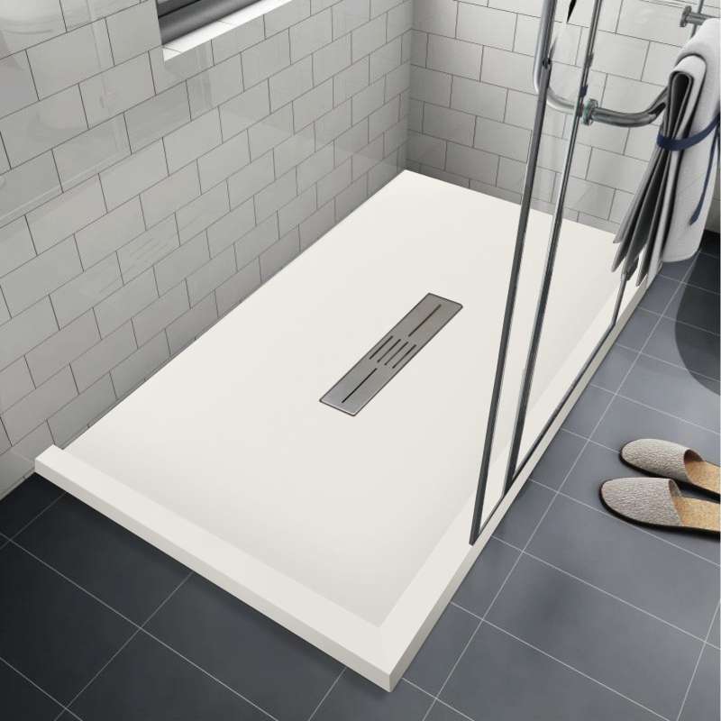 • DRAIN: center drain location with modern rectangular stainless steel drain cover that conceals a conventional 2-in shower drain, creating a pleasing uniform and minimalist design; drain not included