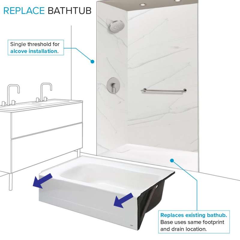 Upgrade your shower with Trimslate single threshold shower bases. Featuring a single add-on threshold that accommodates shower doors effortlessly. Threshold adjusts the maximum depth up to 2.5-in without any trimming of base. Crafted from solid sheet-molded compound material with sturdy structural ribs, it ensures durability and stability. Field trimmable for customization, it installs easily atop thinset mortar. The lightly textured slate floor is slip-resistant and easy to clean.