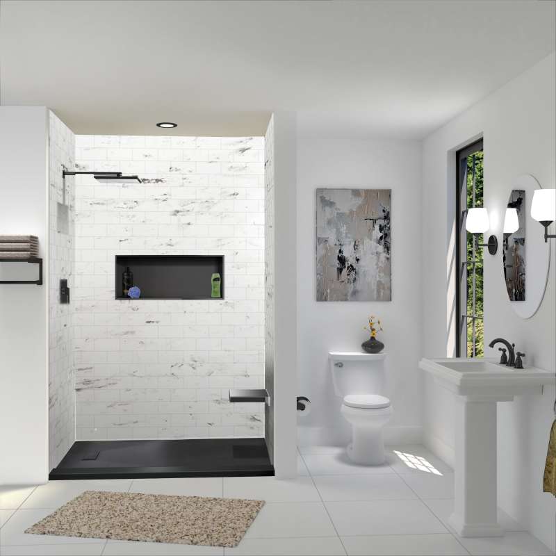 Upgrade your shower with Trimslate single threshold shower bases. Featuring a single add-on threshold that accommodates shower doors effortlessly. Threshold adjusts the maximum depth up to 2.5-in without any trimming of base. Crafted from solid sheet-molded compound material with sturdy structural ribs, it ensures durability and stability. Field trimmable for customization, it installs easily atop thinset mortar. The lightly textured slate floor is slip-resistant and easy to clean.