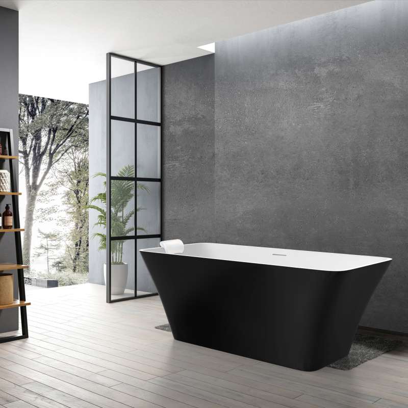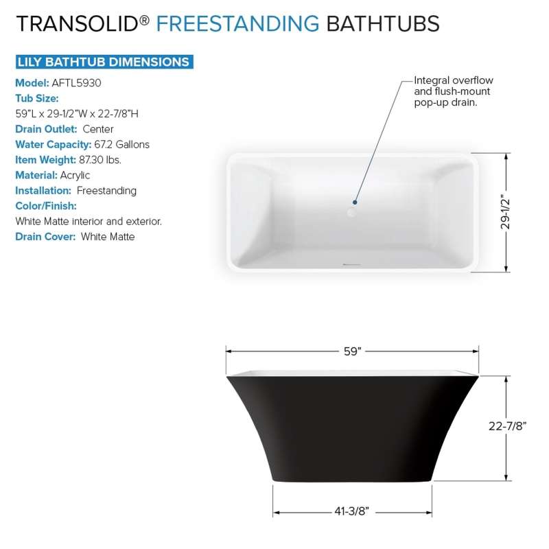 Indulge in luxurious bathing with Transolid's freestanding acrylic bathtub kit. This 59-in matte black tub with pop-up drain and integrated overflow includes a self-adhering bath pillow. Crafted for durability and easy maintenance, Transolid acrylic bathtubs bring modern elegance and comfort to any space.