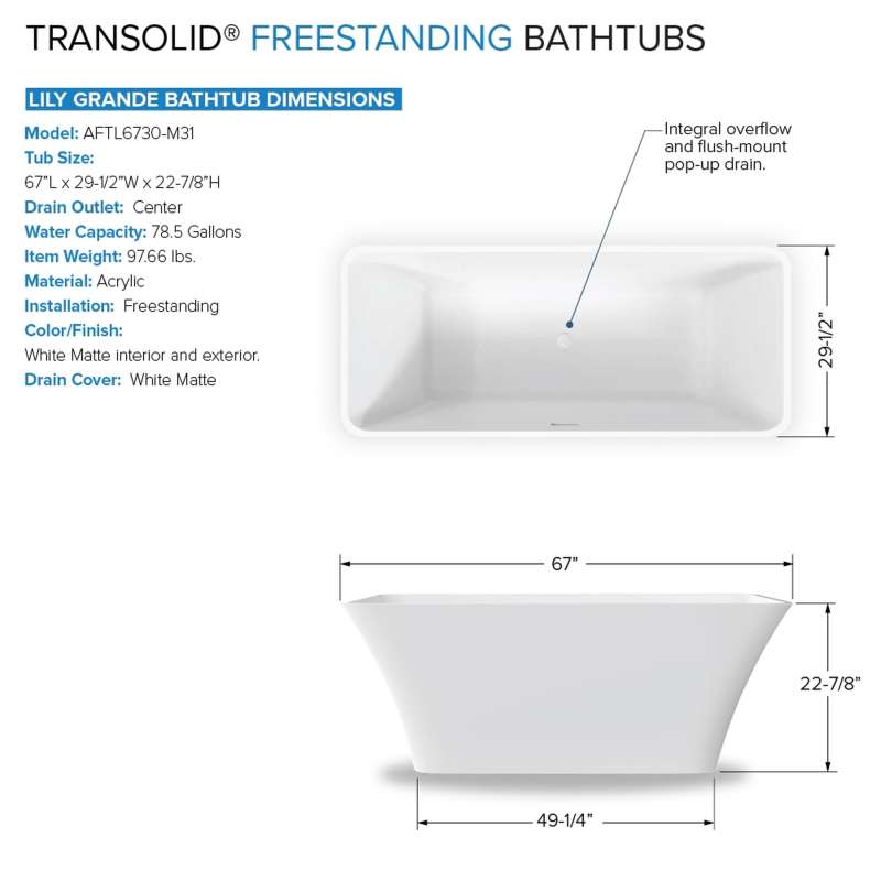 Indulge in luxurious bathing with Transolid's freestanding acrylic bathtub kit. This 67-in matte white tub with pop-up drain and integrated overflow includes a self-adhering bath pillow. Crafted for durability and easy maintenance, Transolid acrylic bathtubs bring modern elegance and comfort to any space.
