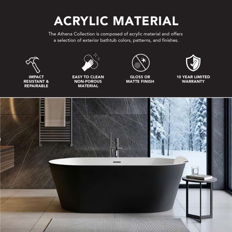 Indulge in luxurious bathing with Transolid's freestanding acrylic bathtub kit. This 59-in matte black tub with pop-up drain and integrated overflow includes a self-adhering bath pillow. Crafted for durability and easy maintenance, Transolid acrylic bathtubs bring modern elegance and comfort to any space.