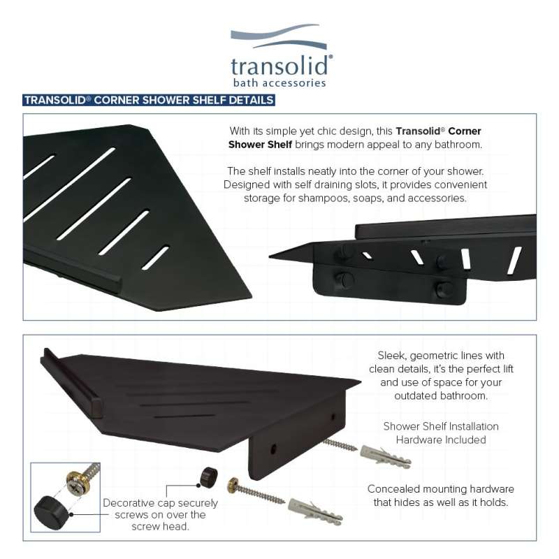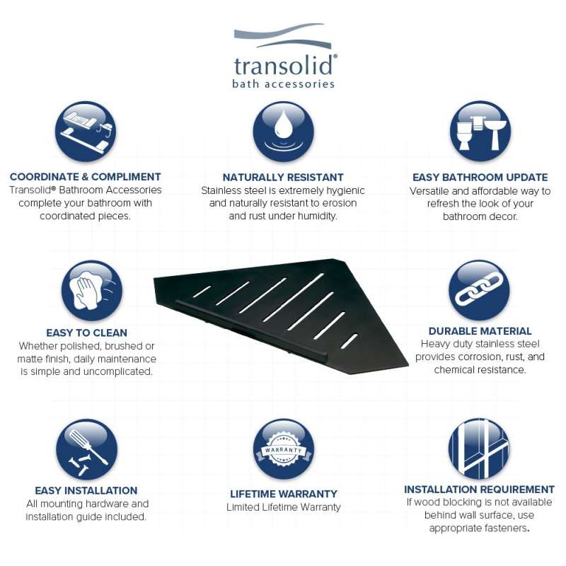 Transolid stainless steel grab bars shelves and corner shelves are beautiful, easy-to-install additions to Transolid Titan, Prodigy, Expressions, and SaraMar solid surface walls, or any other solid surface or tile shower. Achieve peace of mind with durable shelving with a featured rail that won’t let your shower products fall. Sleek, geometric lines create a clean, organized space for a versatile and affordable way to refresh the look of your bathroom décor. Corrosion, rust, and chemical resistant material ensures this sleek design will add to your space without adding to your to-do list.