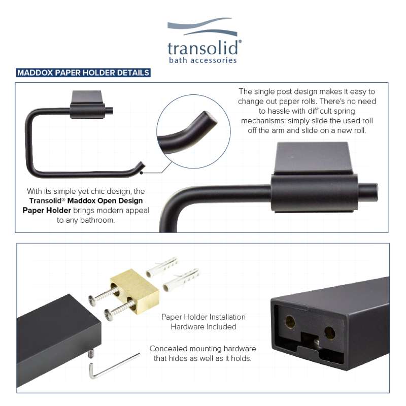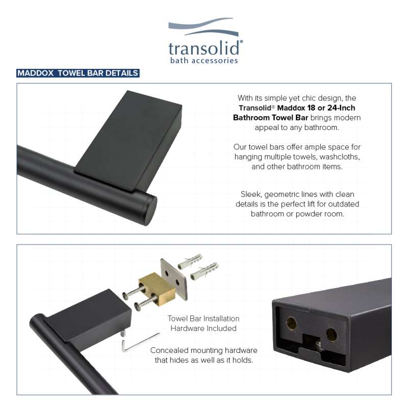 Kit includes Transolid Maddox collection robe hook, toilet paper holder, towel ring, and 24-in towel bar
