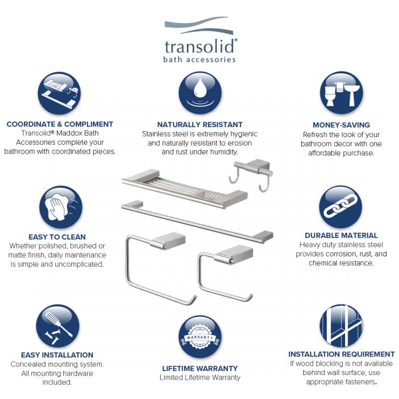Kit includes Transolid Maddox collection robe hook, toilet paper holder, towel ring, 24-in towel bar, and 16-in shelf with soap dish