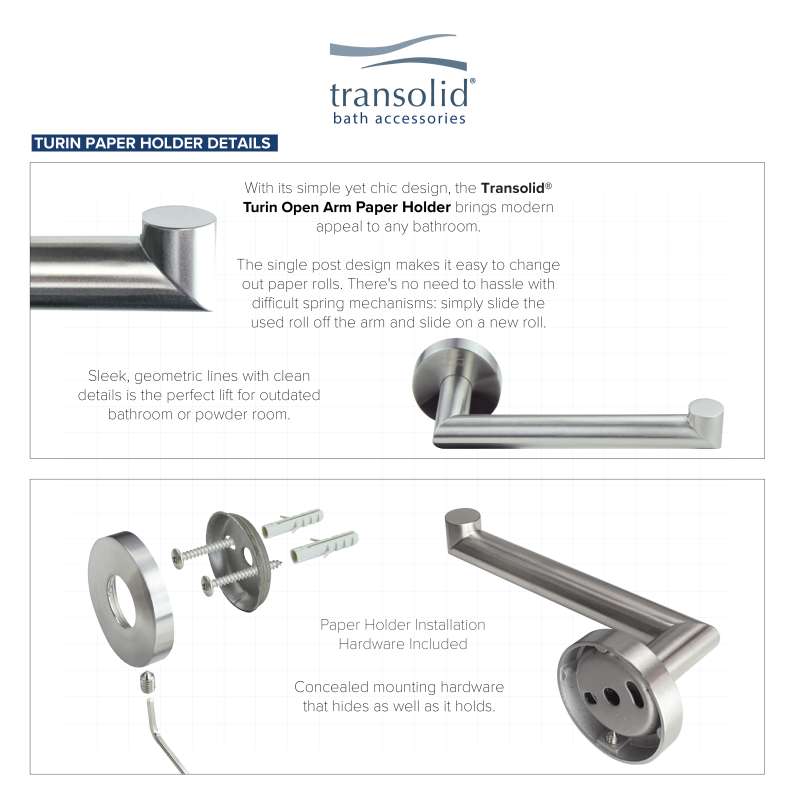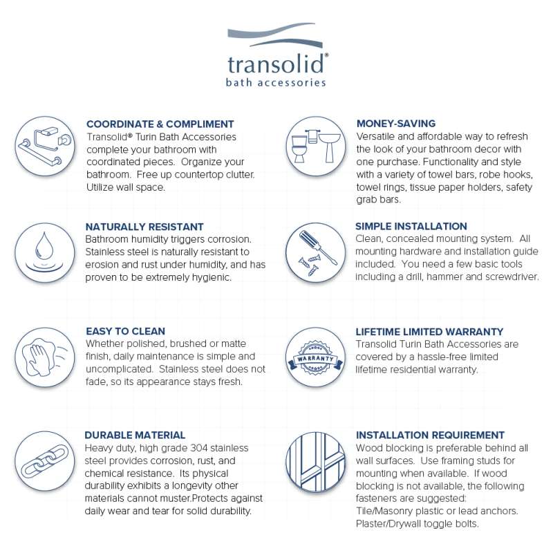 Kit includes Transolid Turin collection robe hook, toilet paper holder, and 24-in towel bar