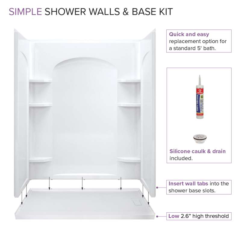 ELEGANT AND EASY: The Transolid all-in-one shower kit combines timeless elegance with the ease of functionality. Complete with two side walls, a back wall, a shower base, a standard drain, and a tube of silicone sealant, this kit has everything you'll need for installation, eliminating the necessity to run to the hardware store. Designed to work together, this shower wall and shower base kit is easy to assemble, by use of tongue-and-groove lock tab installation. The shower walls are constructed of Sterling's Vikrell while the shower base is made of Transtone material, both known for their tremendous strength and durability. The ultra-low shower base is slate textured, offering a unique finish that is also bacteria, scratch, impact, and slip-resistant. With an included 2 inch right-hand drain this shower base seamlessly integrates into your current plumbing system. The shower walls feature a curved design and molded shelves along the back wall which provides convenient storage. The shower walls high gloss finish produces a sleek and shining surface that is easy to maintain.