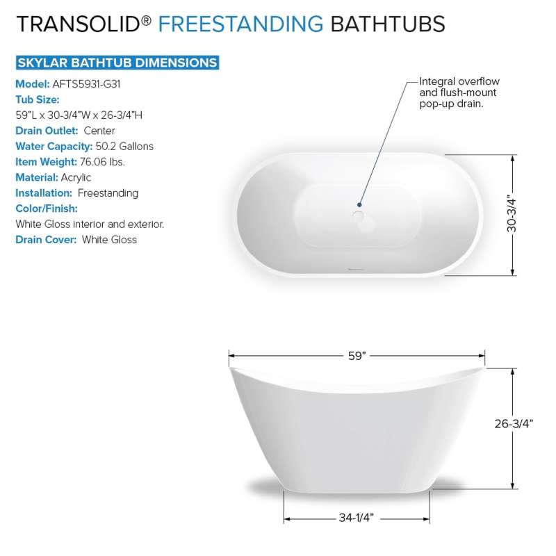 Indulge in luxurious bathing with Transolid's freestanding acrylic bathtub kit. This all-inclusive set features a 59-in glossy white tub with pop-up drain and integrated overflow, stylish tub filler faucet with hand shower, and self-adhering bath pillow. Crafted for durability and easy maintenance, Transolid acrylic bathtubs bring modern elegance and comfort to any space.