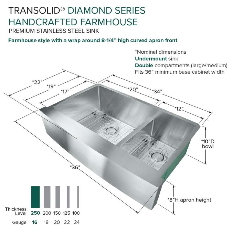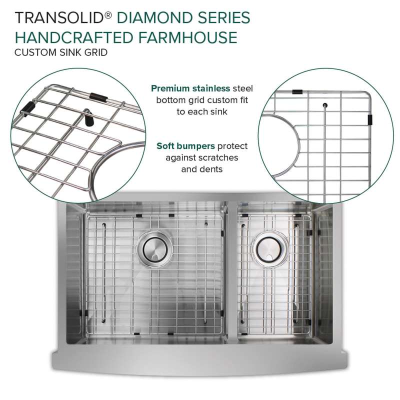 With the Transolid Diamond Sink Collection you can experience the beauty and functionality of a commercial kitchen at a fraction of the cost. Crafted from industrial 304 stainless steel with substantial 16-gauge thickness, which is 2.5 times heavier than similar size sinks available in the market, these luxurious sinks are known for their appeal, durability, and corrosion resistance. The deep 10 in. basins feature channeled grooves along the sink bottom and tight 3/8 in. radius interior corners that work to keep the water moving towards the drain. The underside of the sinks include thick 5 mm sound deadening pads and waterproof undercoating to keep your kitchen quiet and free from unwanted condensation. Included with every Transolid Diamond Sink is a universal sink drain kit with standard 1-1/2 inch pipe fittings, a magnetic accessories kit consisting of a hook, ledge, and sponge holder, which can easily adhere to the side of the sink by applying the included magnetic tape along the underside. A matching stainless steel sink grid with rubber bumpers to keep your sink protected from scratches and a sleek stainless covered flip-top sink strainer are also included. The long-lasting brushed finish sink and included accessories will compliment any kitchen and provide a true sense of culinary excellence. Transolid Diamond Sinks are all backed by a lifetime limited warranty.